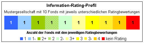 Das Information-Rating bewertet Fonds in den Bewertungsstufen 1 (beste Bewertungsstufe), 1-, 2+, 2, 2-, 3+, 3, 3-, 4, kein Rating (niedrigste Bewertungsstufe) und keine Daten. Für die Bewertungen 1 bis 4 sind nach Einschätzung der Ratingagentur aus Anlegersicht wesentliche Mindestanforderungen definiert. Verfehlt ein Fonds eine dieser Mindestanforderungen, wird kein Information-Rating erteilt.